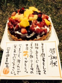 トマト串マイスターの女将です。 ・ 本日、宅急便で贈り物が届きました。 大将からのサプライズのプレゼントでした。 ・ フルーツいっぱいのケーキに感謝状メッセージ。 素敵なプレゼントに 涙があふれでてしまいました。 ・ 大将ありがとう。 こちらこそ大将に感謝てします。 ・ 毎日が大忙しの女将は 元気に復活しました。 ・ 今日も笑顔で頑張り〼