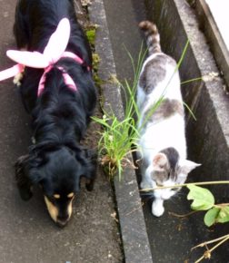 仲良しワン、ニャンと梅雨が開けお散歩です。