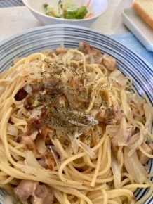 ペペロンチーノパスタの仕上げにスライスだっきょを